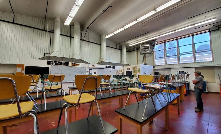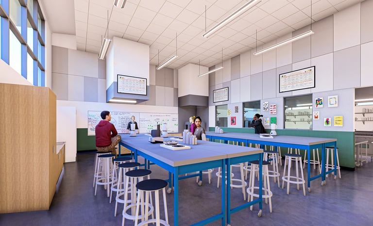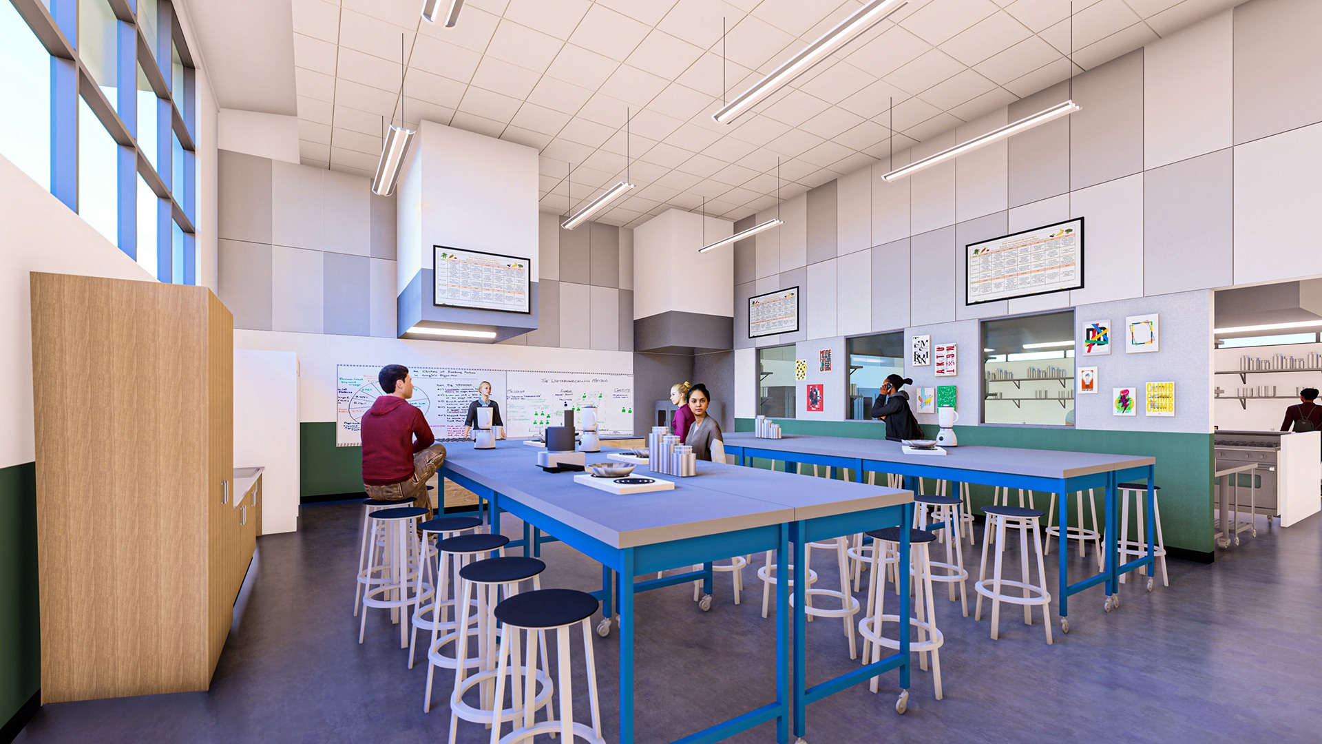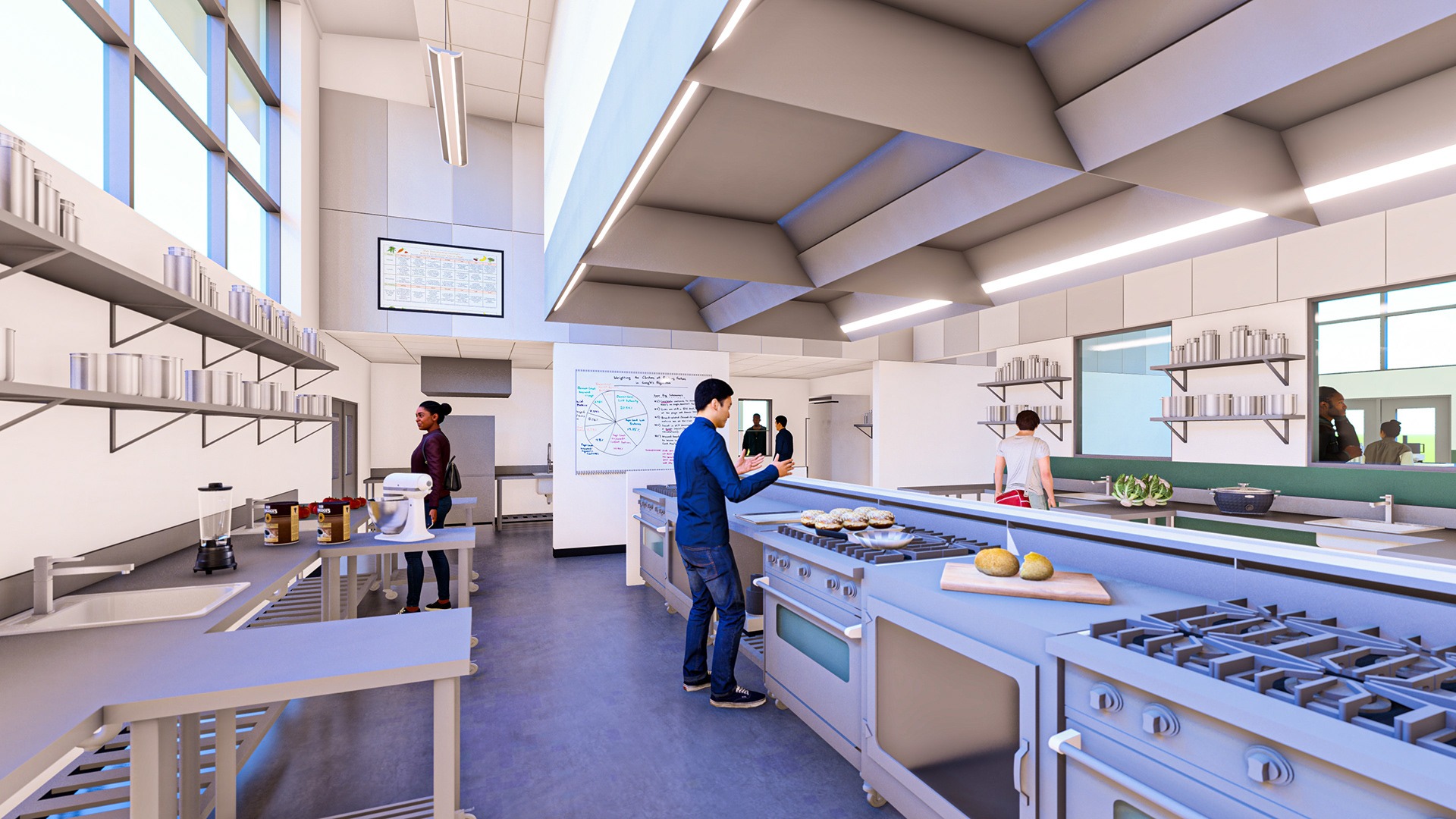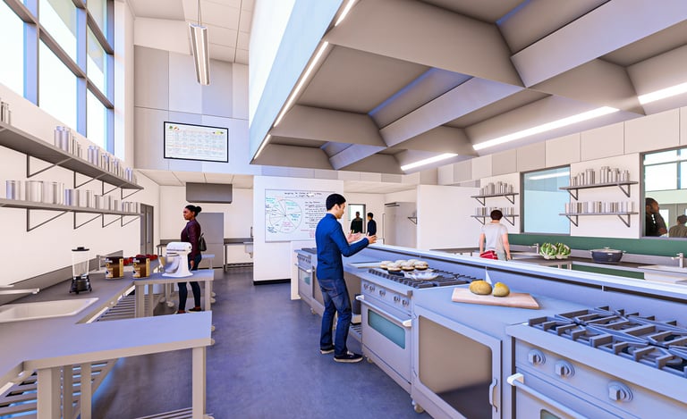 The Culinary Arts Center at Castro Valley High School was developed from a former auto shop that was later used as a physics classroom. This new CTE facility features a flexible culinary classroom with a teaching station and a fully equipped, future-proofed all-electric commercial kitchen. Designed to support a dynamic program, the space can also be configured to simulate a real restaurant setting.